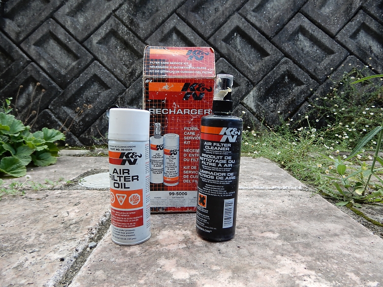 エアクリーナーエレメントの清掃に使うクリーナー(右)と