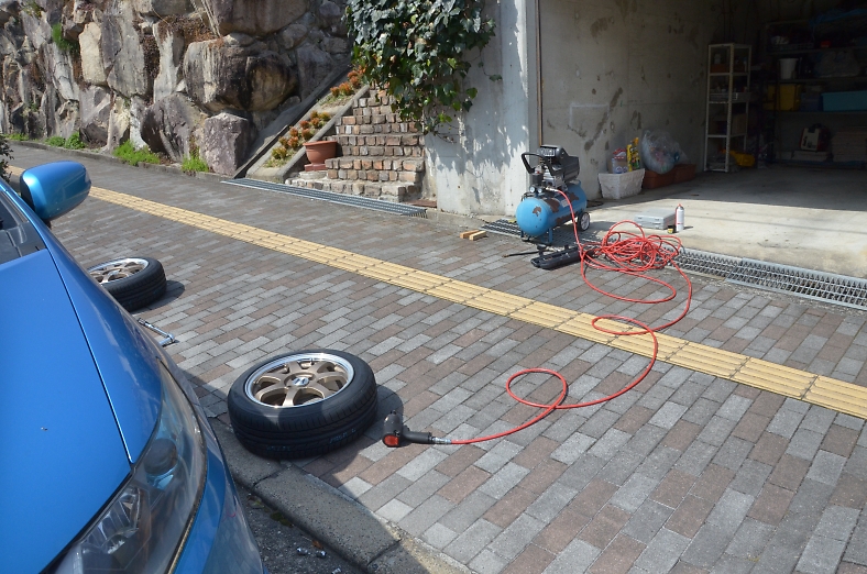 エアーコンプレッサー、エアーインパクトレンチ、トルクレンチ、タイヤ圧計などの必需品を駆使しました。